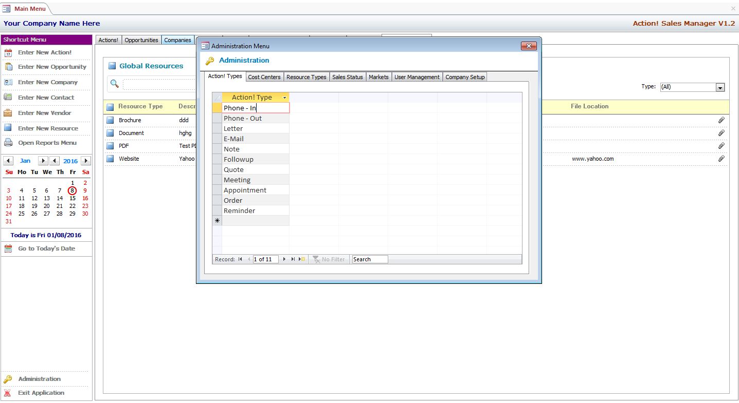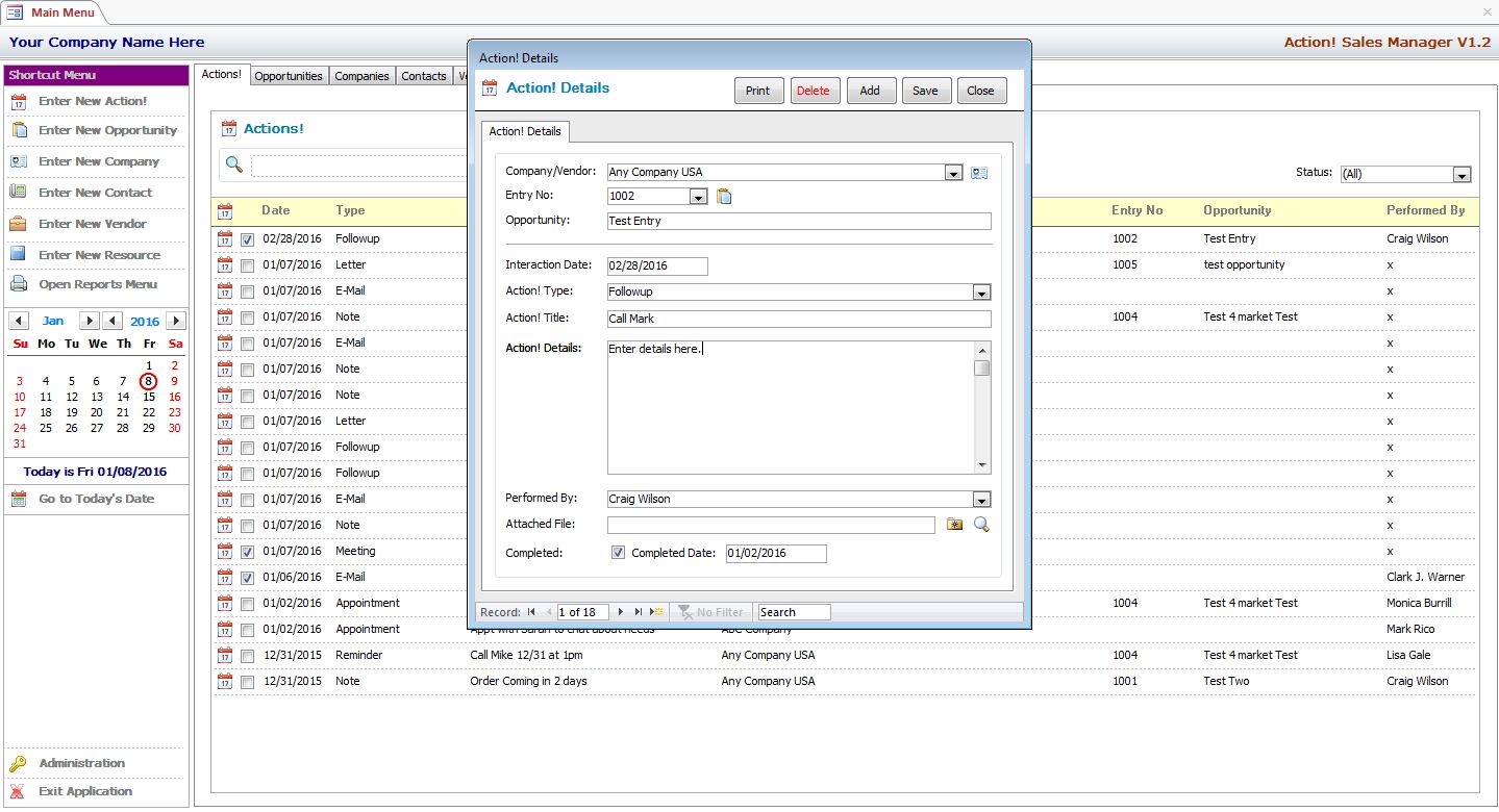 MS Action! Sales Manager is Based on a System of Simplicity which Uses a Minimalistic Approach to Manage Contacts, Leads, Opportunities and Actions! with Minimal Data Entry. Actions! Can Be User-Configured to Include Tasks, Followups, Appointments, Reminders, Calls Due and More!