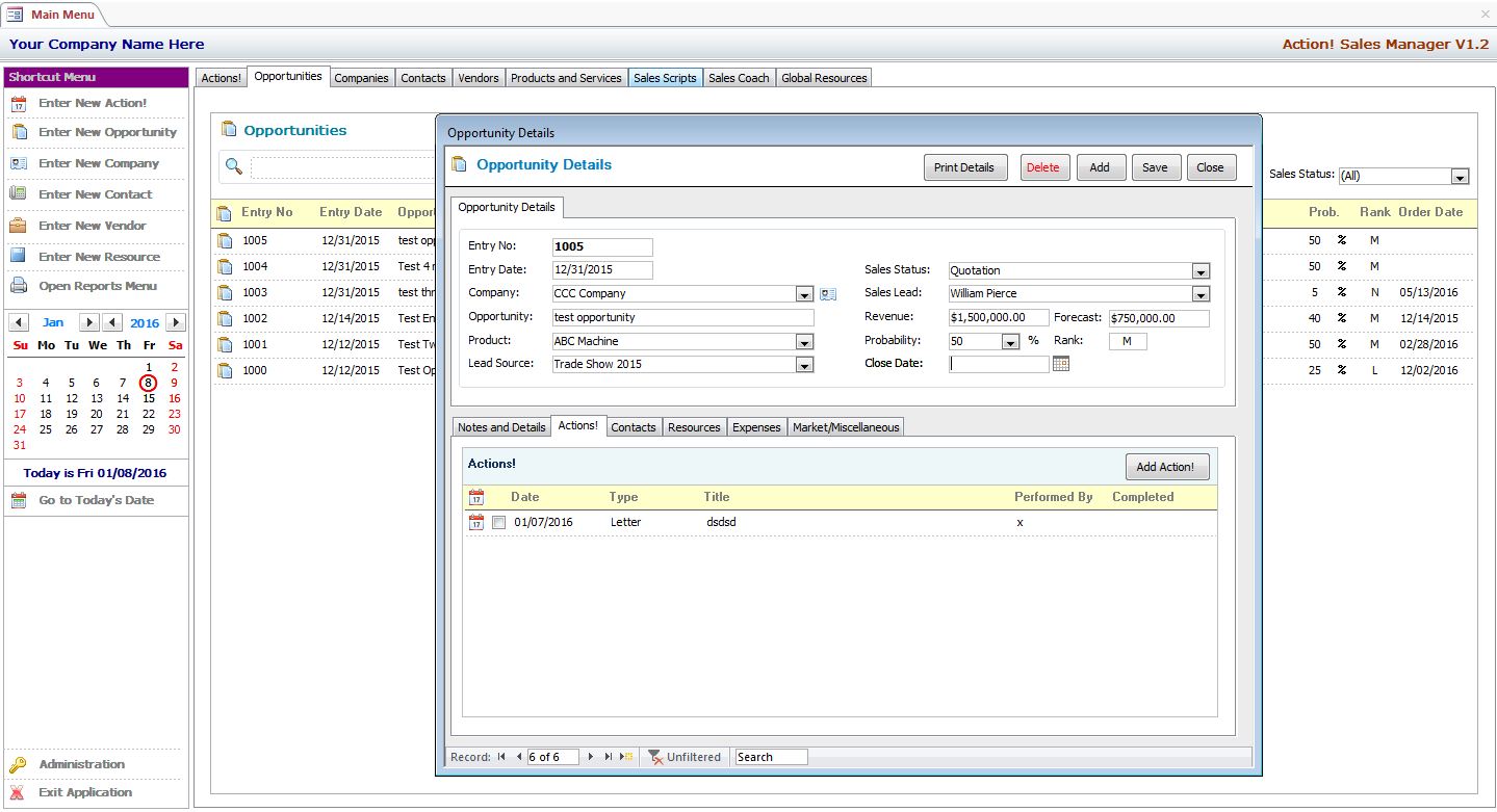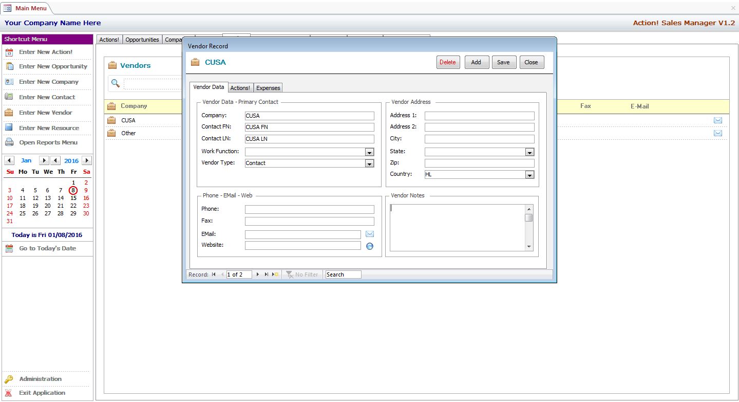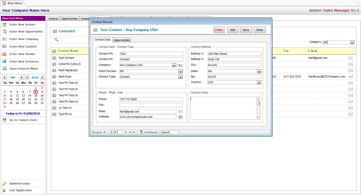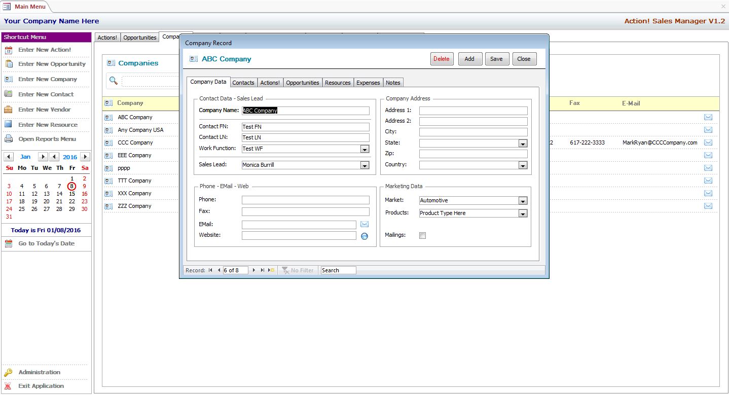 MS Access Action! Sales Manager is a Full Featured Professionally Developed Database and Forms Library Designed to Manage Companies – Contacts - Vendors – Sales Opportunities and Related Actions with Ease!