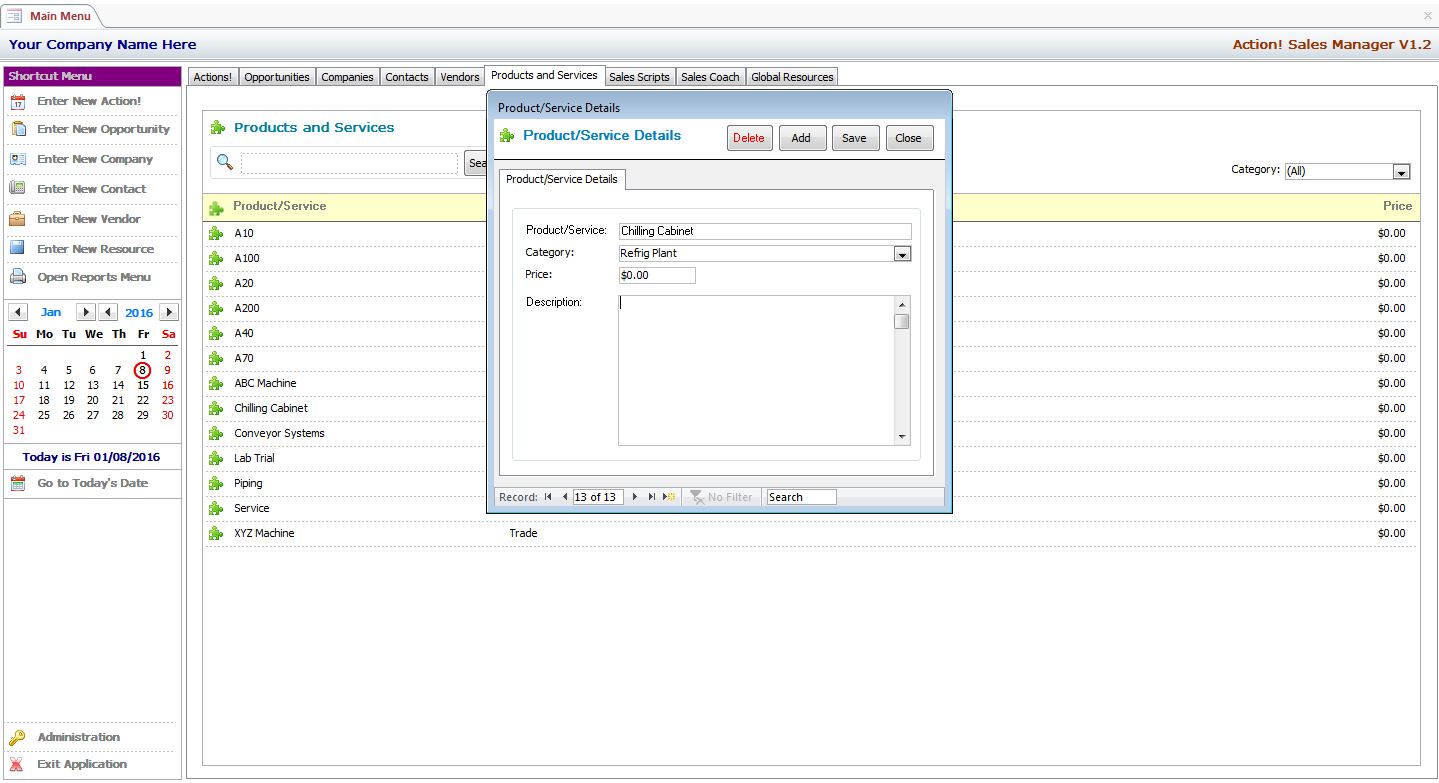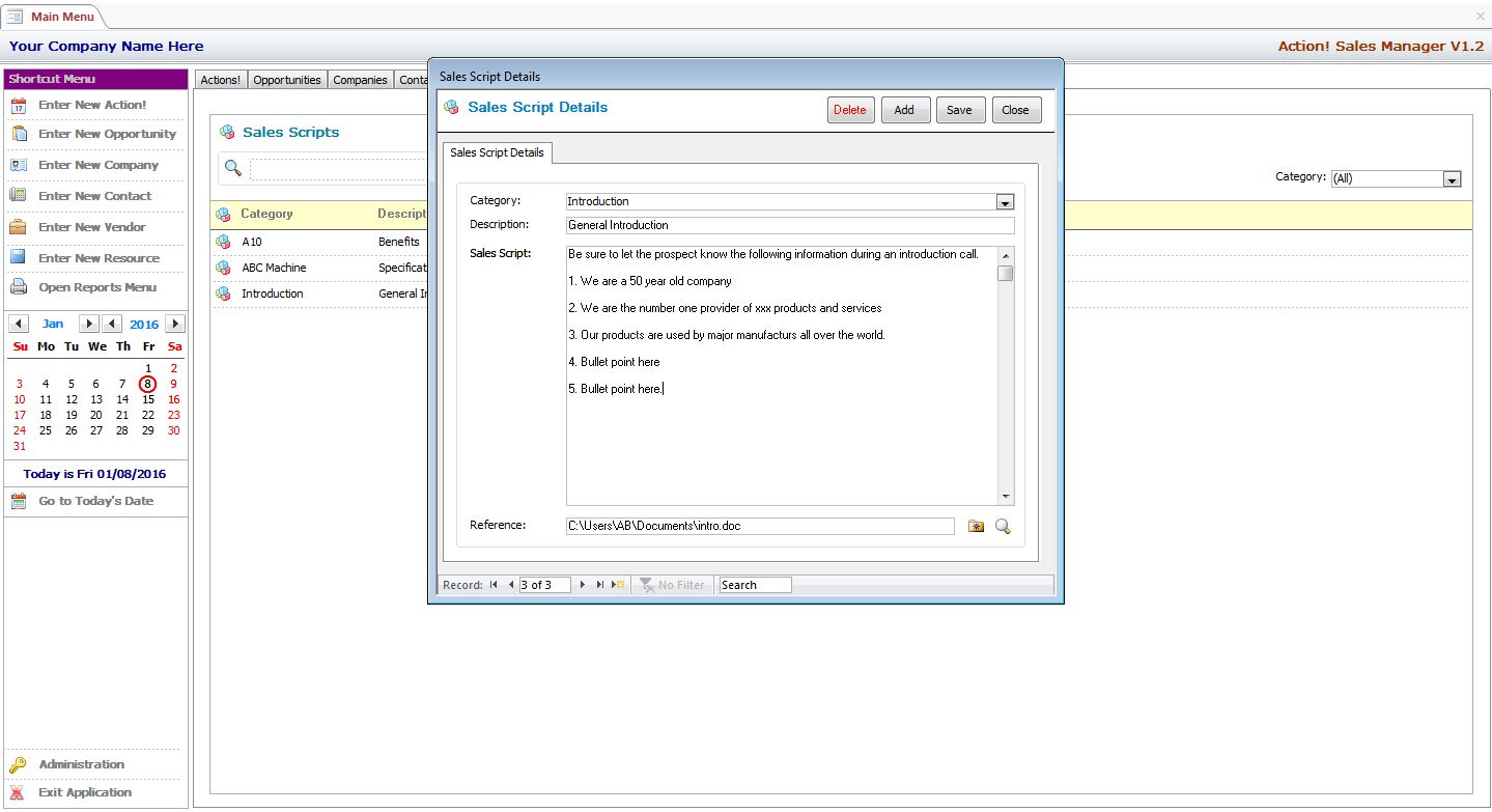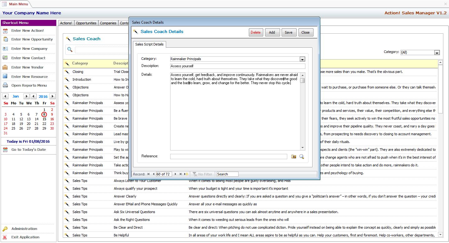 MS Access Action! Sales Manager Includes User Definable Sales Scripts that Keep Your Sales Staff On-Track by Providing Consistent Information to Your Clients. We Also Include a Built In Sales Coach with Over 100 Categorized Sales Tips - You Can Even Edit Them and Add Your Own!