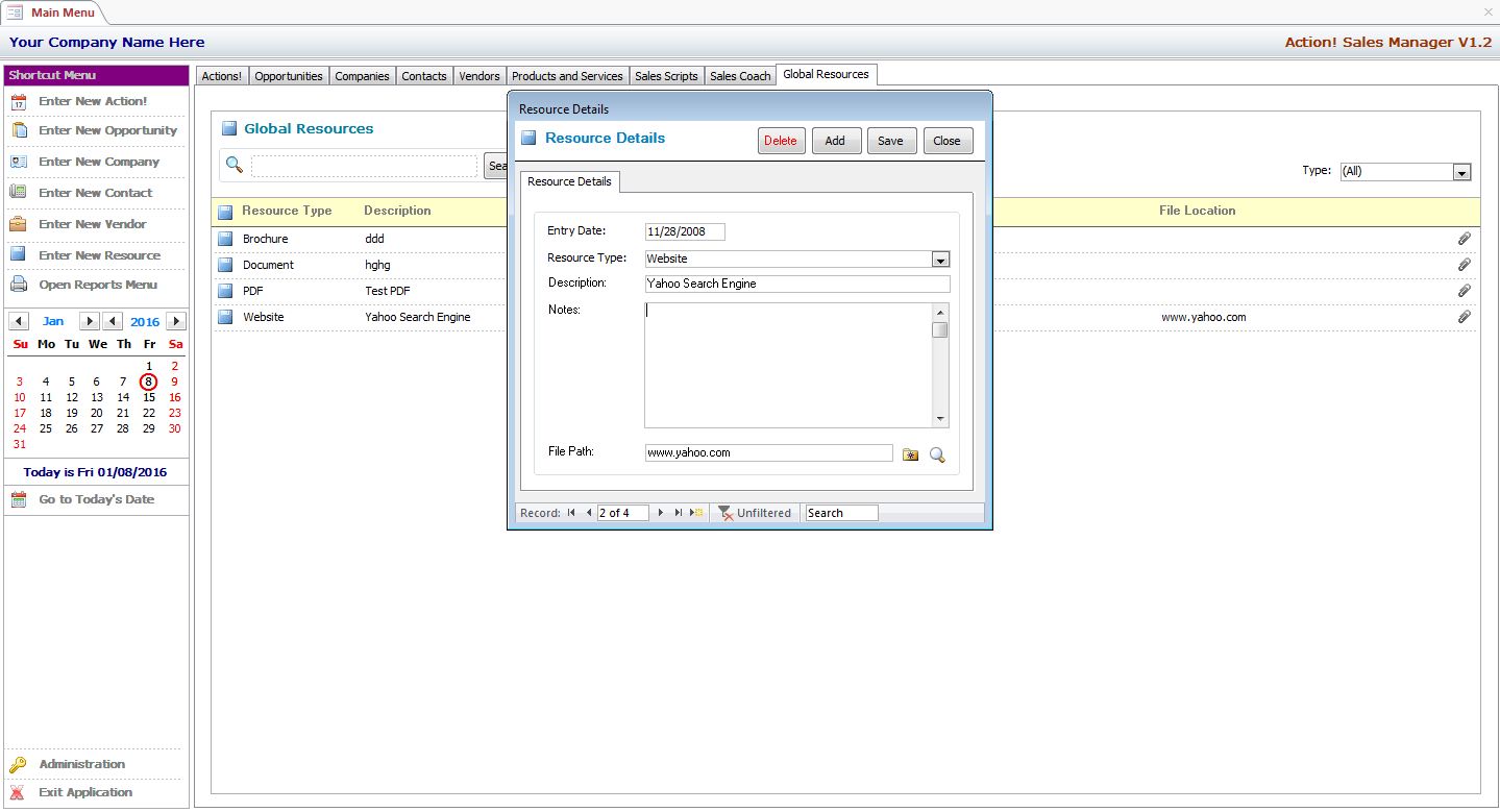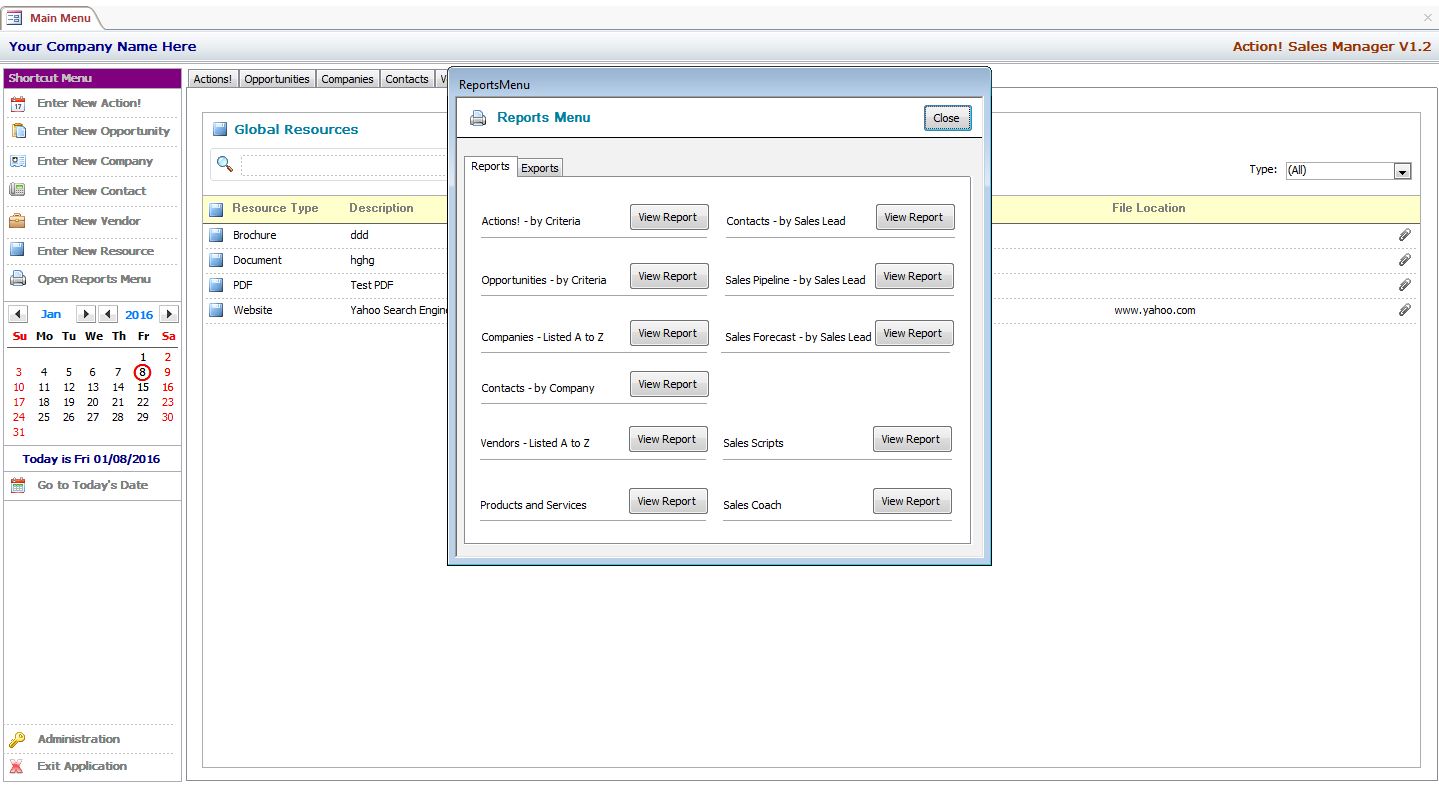 You Can Have a Full Featured Sales Lead and Opportunity Management System Up and Running in No Time Flat! The MS Access Action! Sales Management System Can be Used as a Complete Application As-Is, or Developers May Use it as a Forms Library to Add One or More of the Pre-Developed Forms in Your Own Applications. The MS Access Action! Sales Manager Template Can be Used as Provided or Can Be Customized to Suit Your Most Demanding Needs. The Database Features an Innovative and User Friendly Tabbed Menu Interface that Automatically Scales to Various Monitors and Screen Sizes.